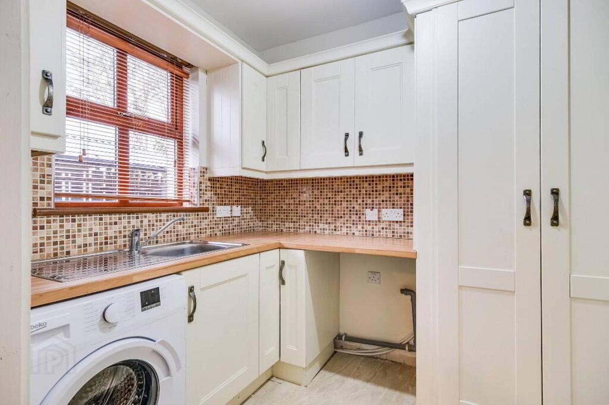 washing machine, stainless steel sink unit, tiled floor &