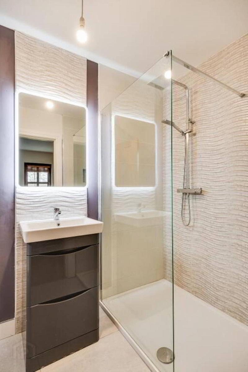 thermostatically controlled shower, decorative tiles, half tiled walls & floor, vanity unit, recessed lighting, adjacent to Lounge/Bedroom 5.