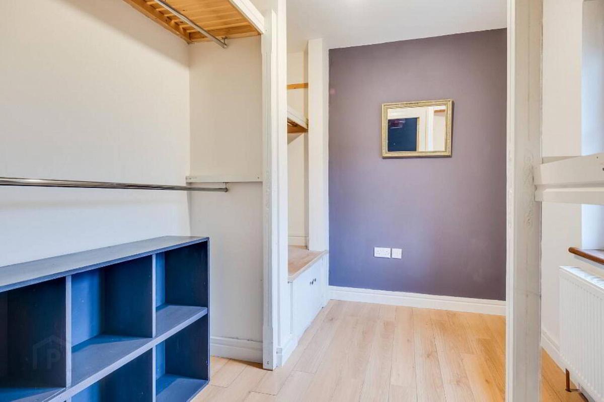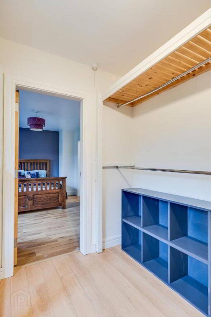 Fitted shelving including hanging rails, laminate flooring.