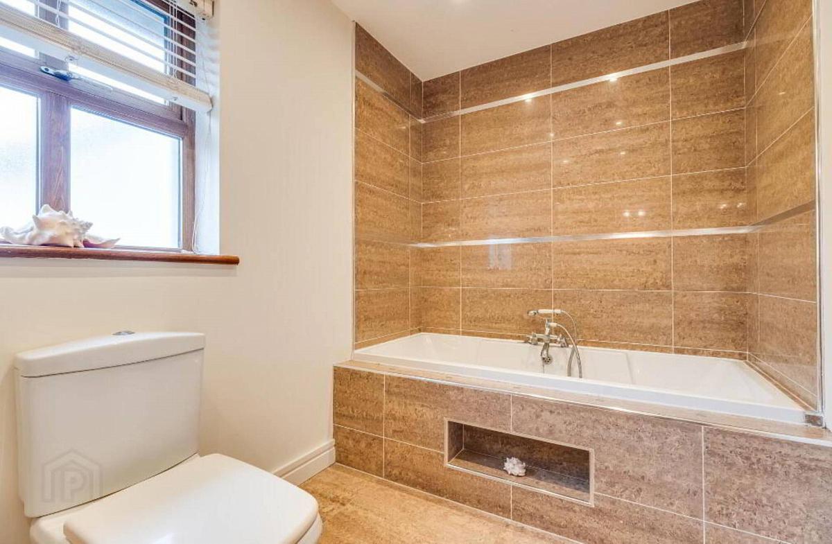 heated towel rail, tiled floor, tiled splash back & bath with feature shelving, telephone shower taps to bath, recessed lighting.