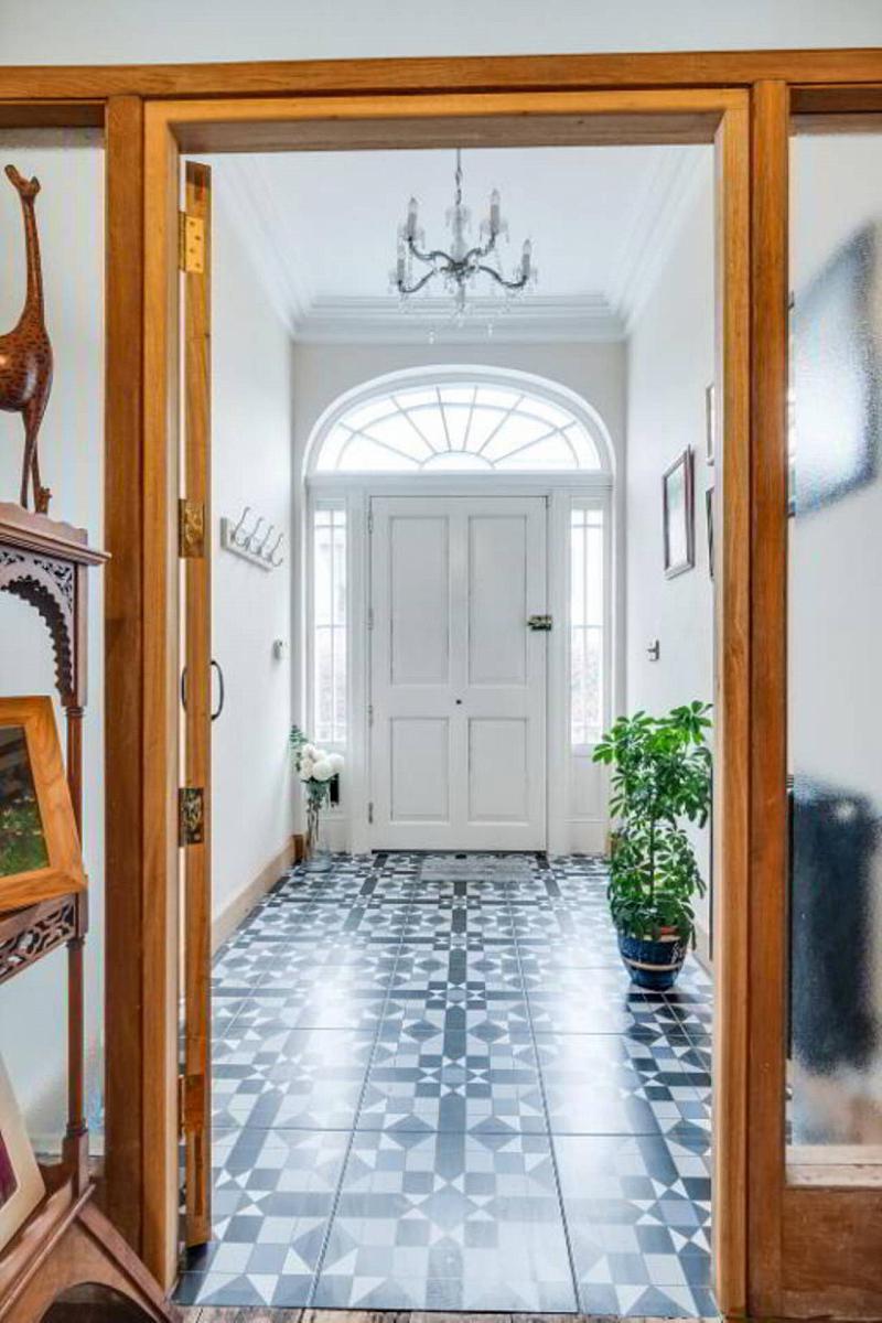 Cloaks cupboard, decorative tiled floor.