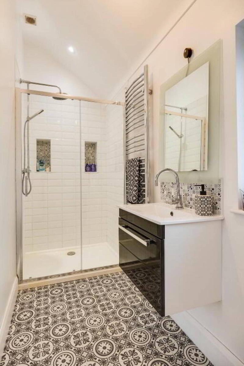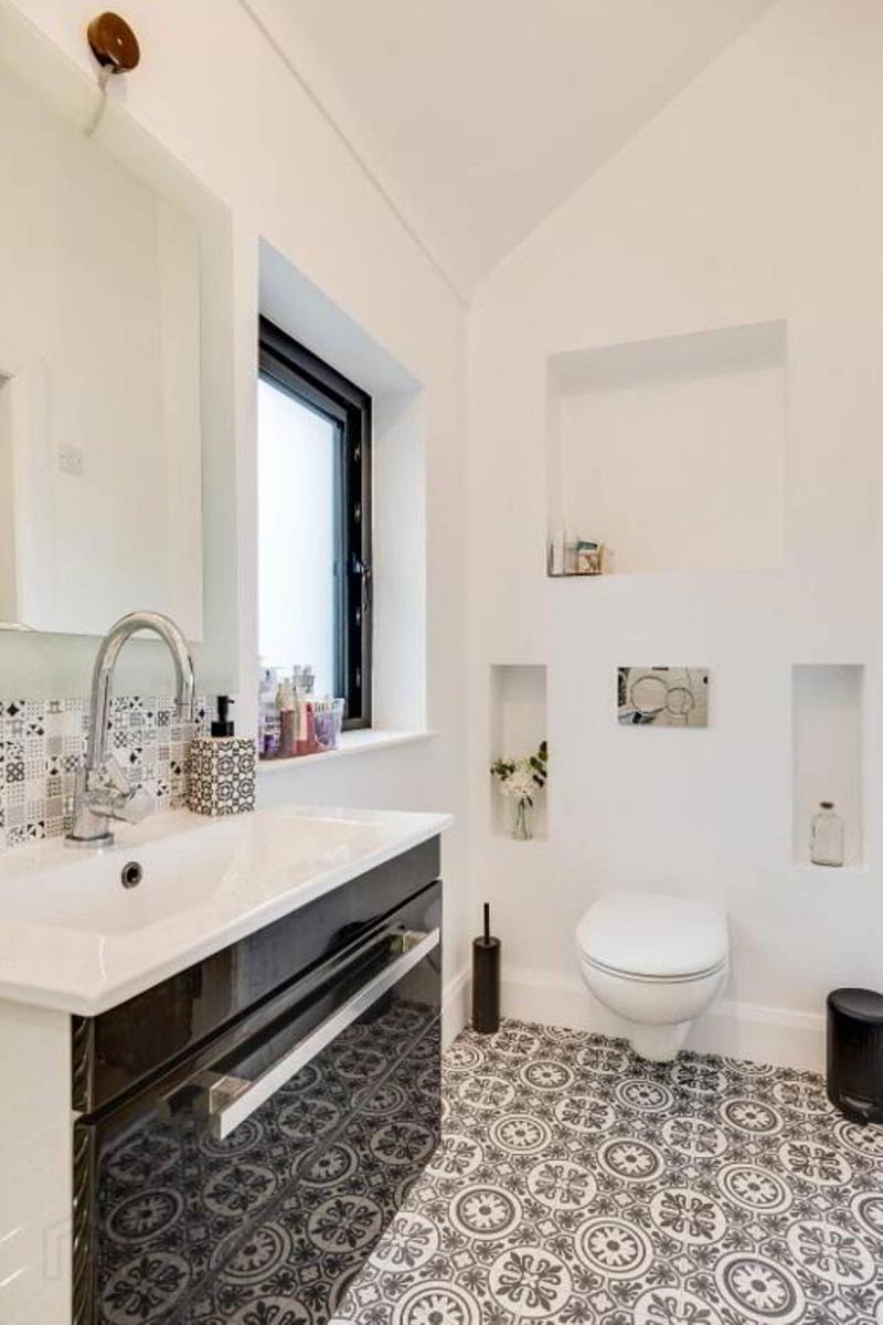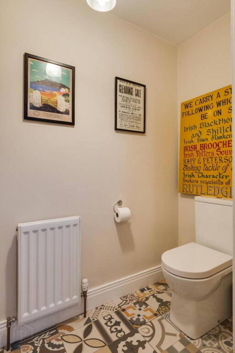 Wc whb, decorative tiled floor.