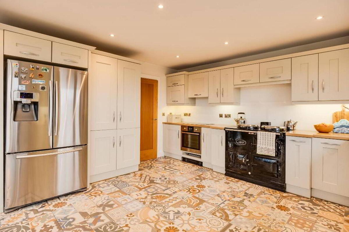 Fully fitted Kitchen with an extensive range of high & low level units, AGA oil fired cooker, integrated hob, oven & grill, dishwasher, fridge freezer, decorative tiled floor, recessed lighting, feature corner window with views towards the River Erne.