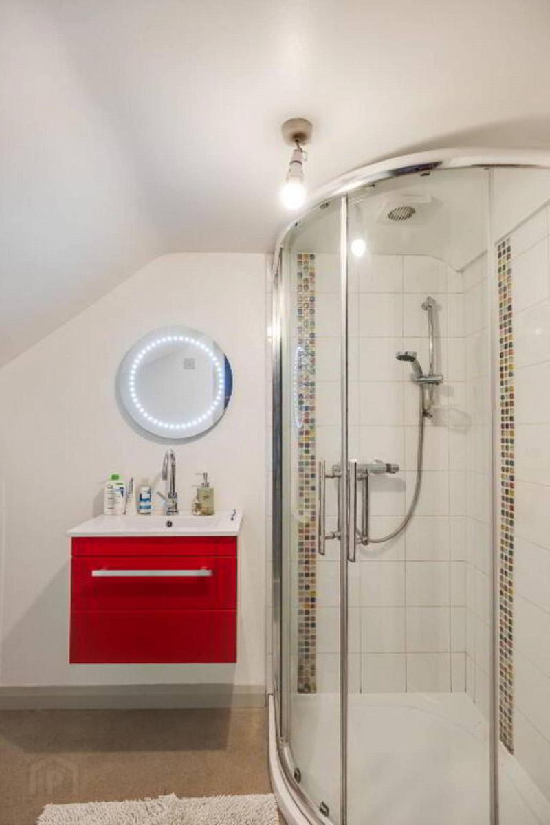 Ensuite: 7'6" x 5'6" White contemporary style suite, concealed wc with push button control, step in shower cubicle, vanity unit, cushion flooring & tiled splashback.