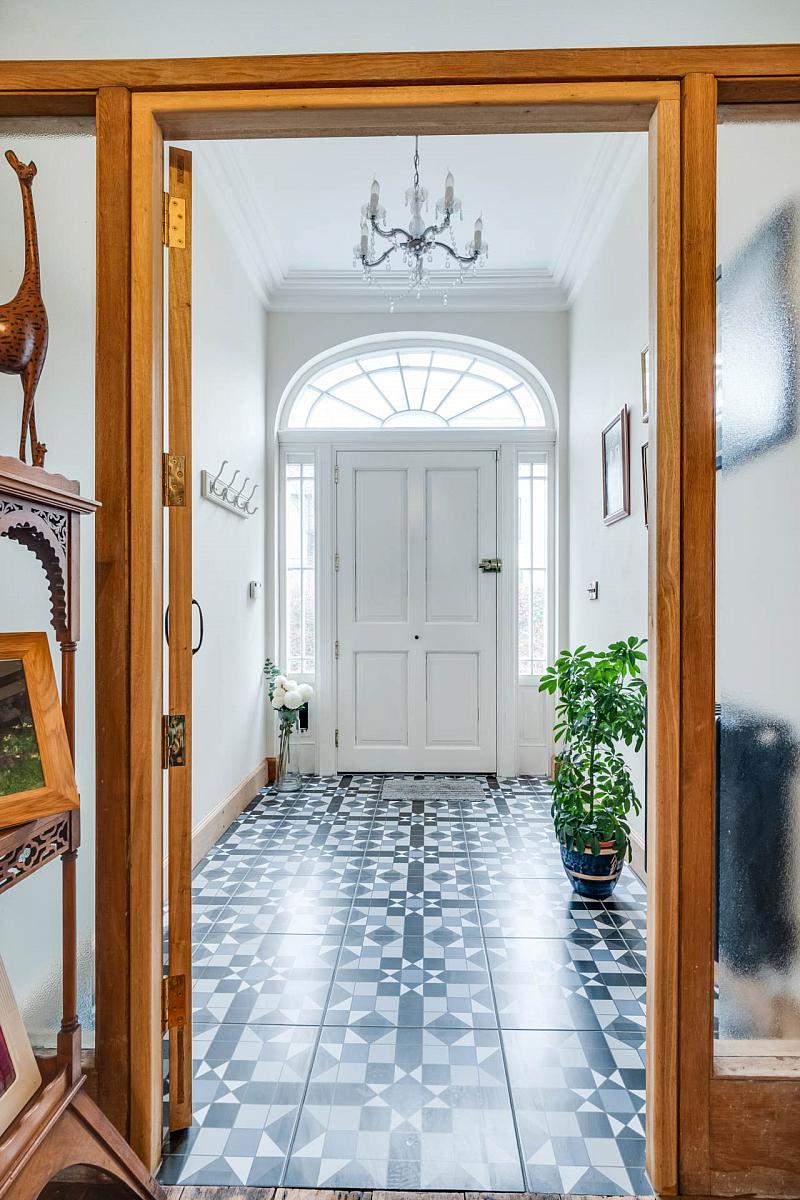 Panelled exterior door with fan light window, tiled floor, solid oak door with glazed inset, fan light window and side screen to Entrance Hall.