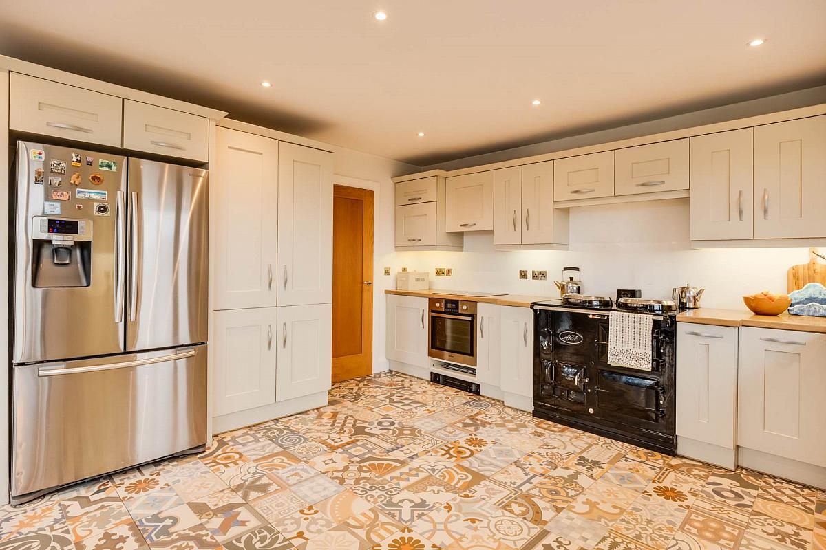 Fully fitted with an extensive range of high & low level units, AGA oil fired cooker, integrated hob, oven & grill, dishwasher, fridge freezer, decorative tiled floor, recessed lighting, feature corner window with views towards the River Erne.