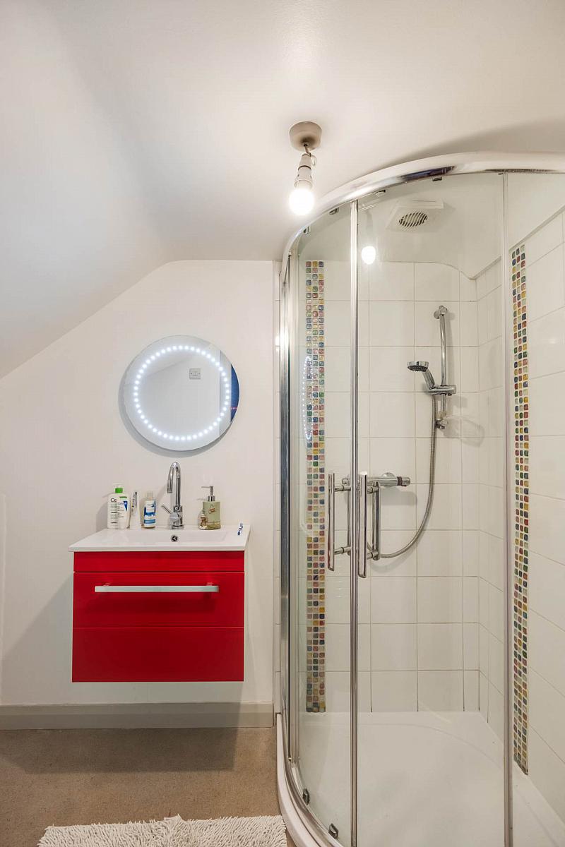 cubicle, vanity unit, cushion flooring & tiled splashback.