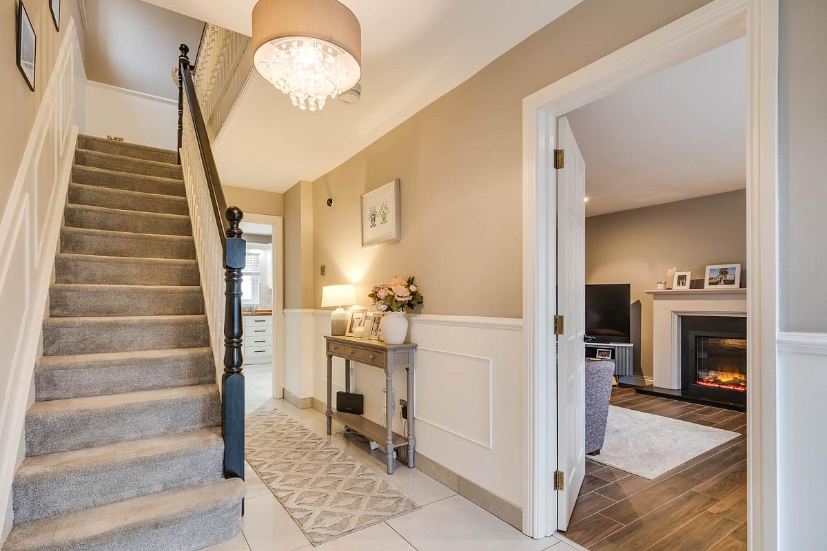 Composite door with glazed inset, glazed side screen, tiled floor, dado rail, moulded wall panelling