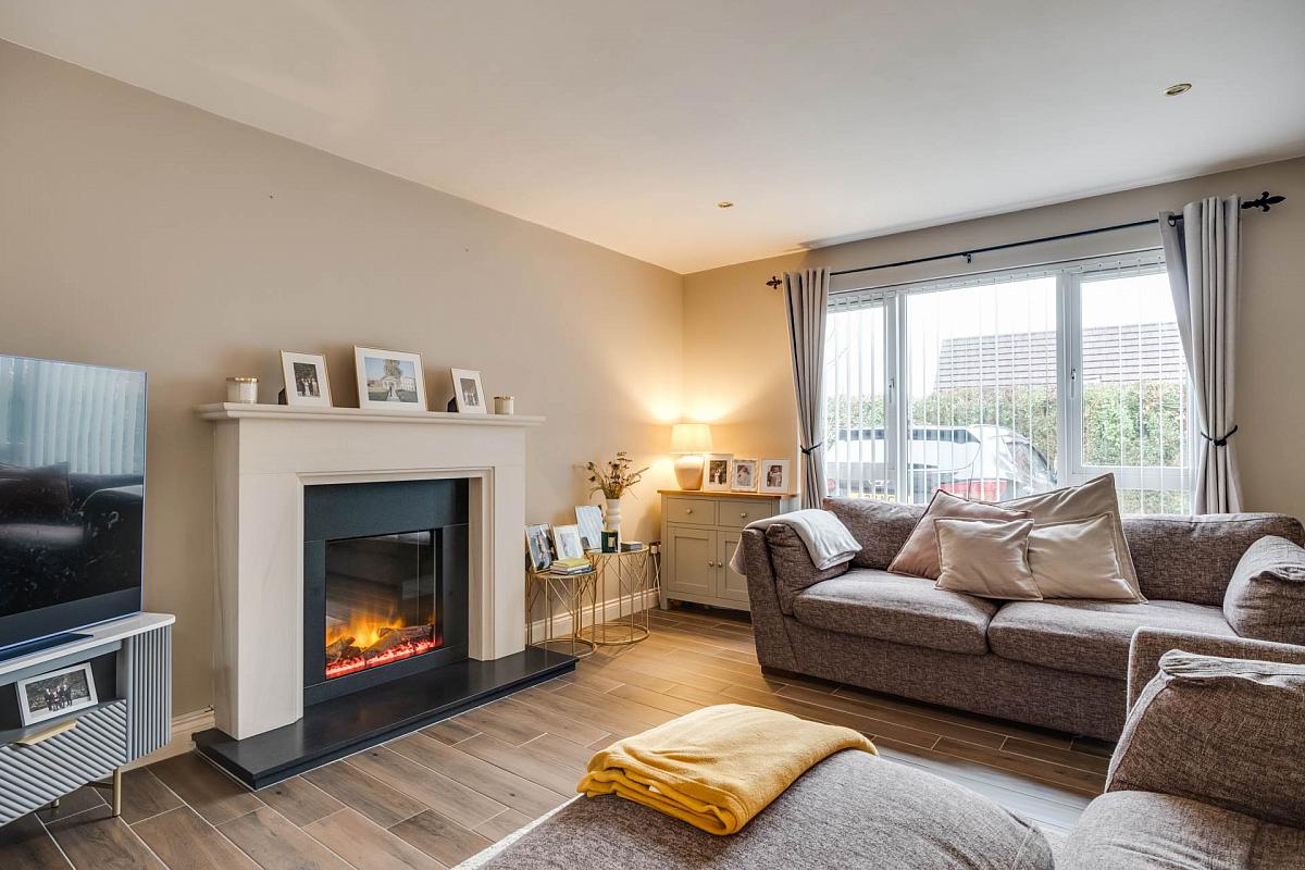 Contemporary style arble fireplace surround with granite inset & hearth, easy to maintain electric fire, wood grain tiled floor, moulded wall panelling, recessed lighting