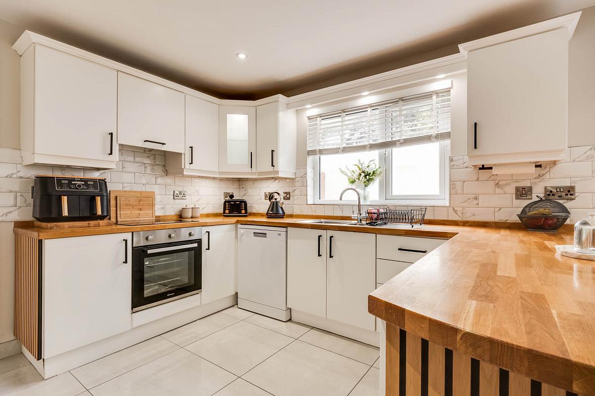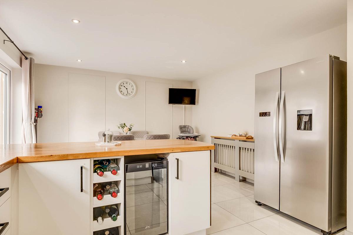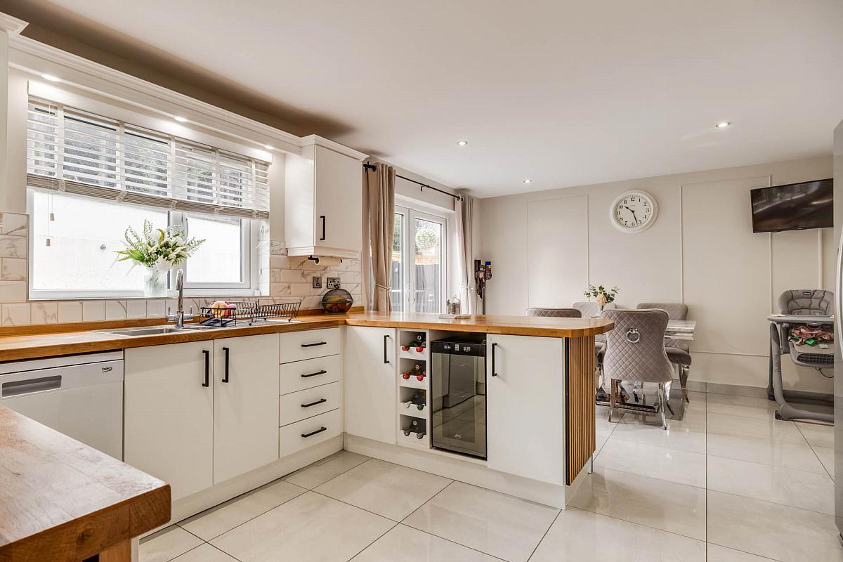 Modern fitted kitchen with a range of high & low level units, solid wooden work top, breakfast bar, integrated hob, oven & grill, extractor fan hood, plumbed for dishwasher, stainless steel sink unit, wine cooler, wine rack, decorative panelling, tiled floor & splash back, plumbed for fridge freezer, moulded wall panelling, recessed lighting & unit lighting, built in storage cupboard, glazed interior doors, double patio doors opening onto south facing rear garden & decking area