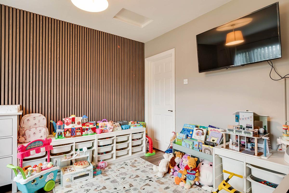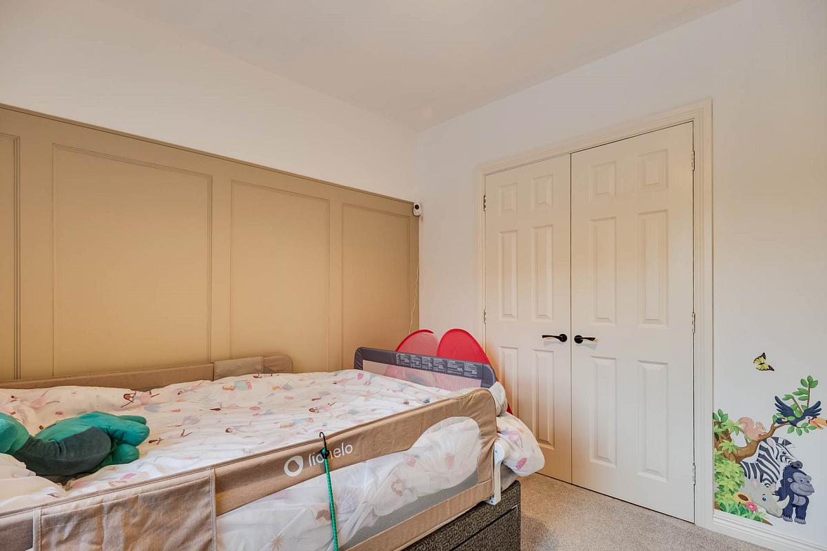Feature wall panelling, built in double wardrobe