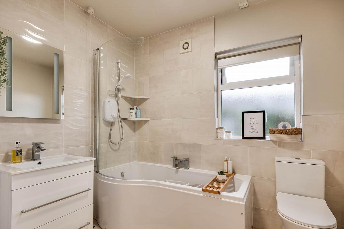 White suite including thermostatic shower over bath, shower screen, vanity unit, tiled walls & floor