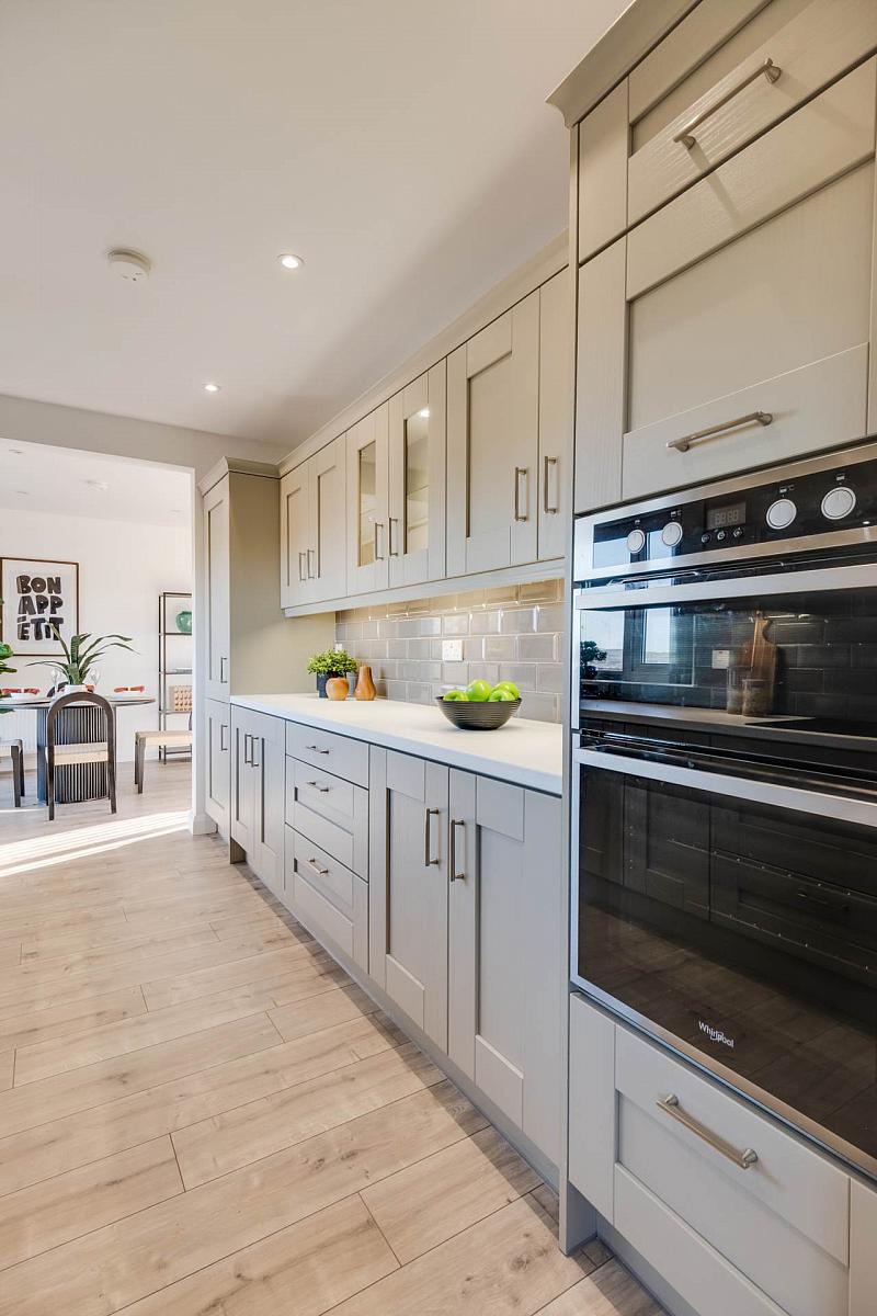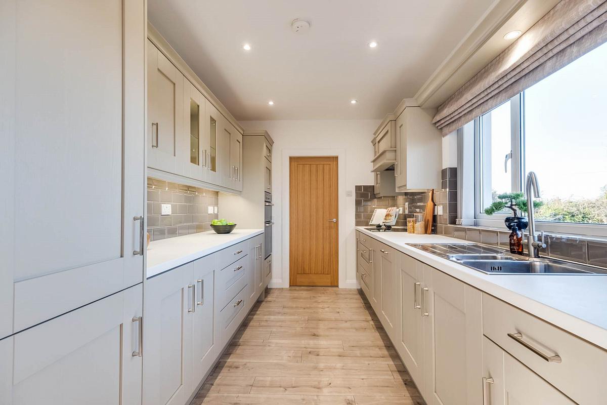 Modern fitted kitchen with an attractive range of high & low level units including glazed display unit, integrated induction hob, eye line double oven & grill, fridge freezer & dishwasher, extractor fan hood, stainless steel sink unit, tiled splash back, laminated floor, recessed & unit lighting.