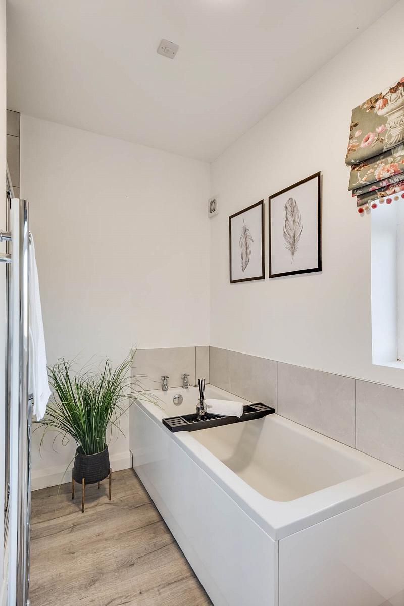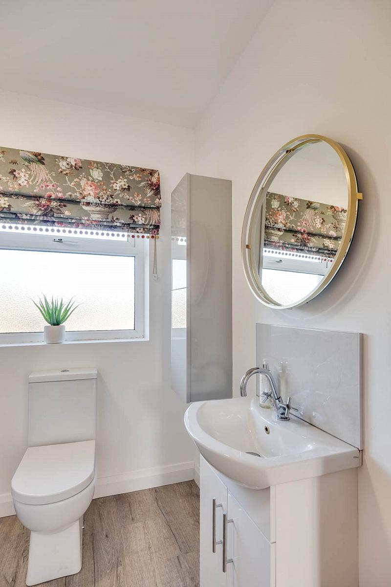 Fitted suite including step in shower cubicle with thermostatically controlled shower, tiled splash back, laminated floor, heated towel rail.