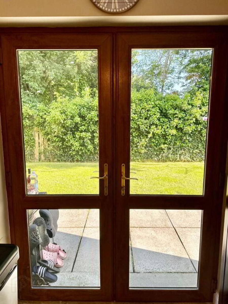worktop, plumbed for dishwasher, extractor fan hood, tiled floor and splashback, double patio doors to private rear garden.