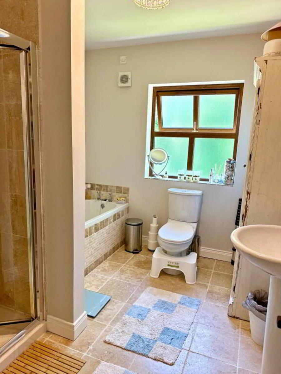 thermostatically controlled shower, tiled panelled bath, floor and splash back.
