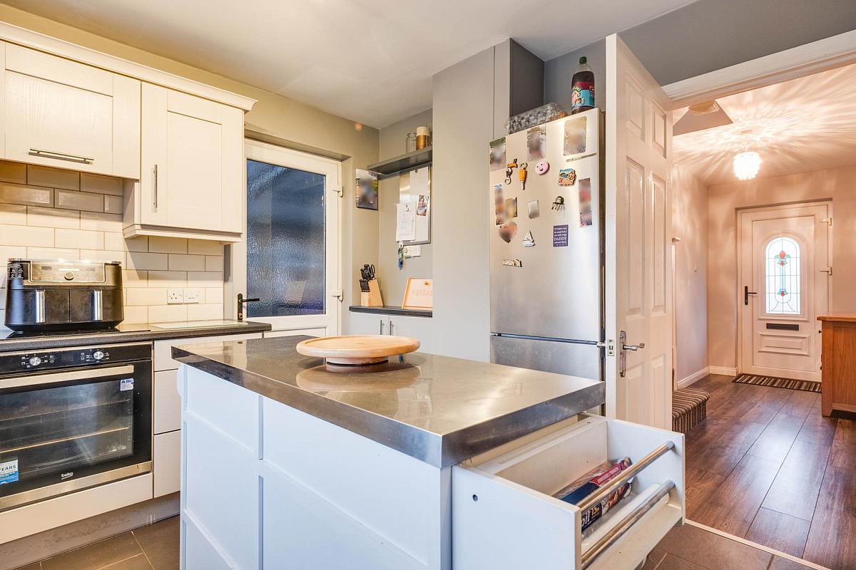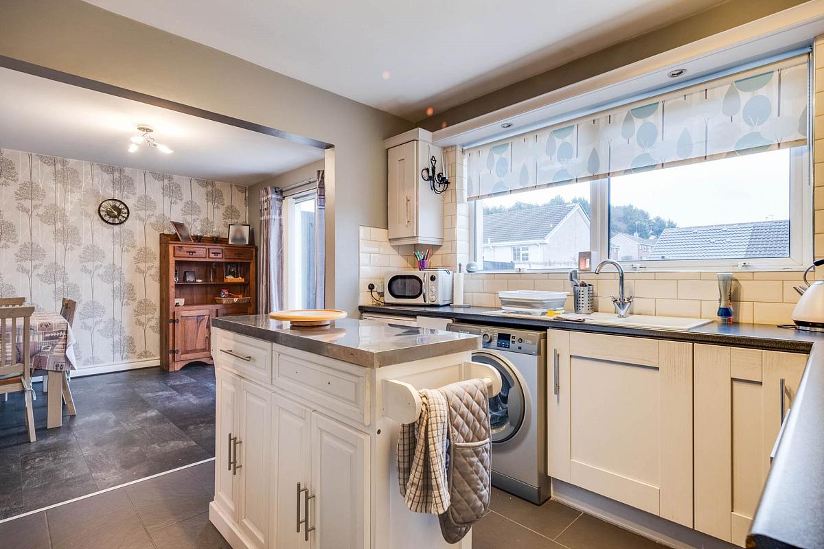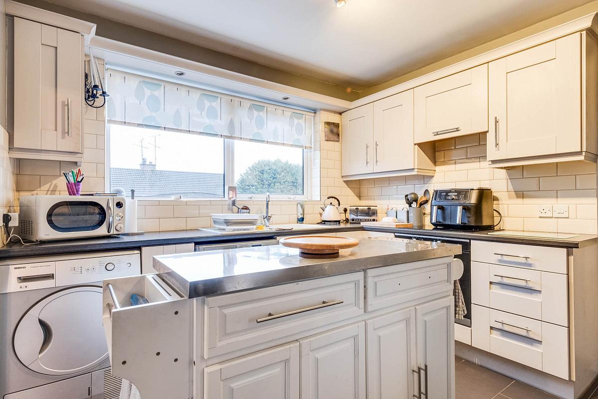 Fitted kitchen with a range of high & low level units, integrated hob, oven & grill, extractor fan hood, island unit, plumbed for washing machine, composite sink unit, tiled floor & splash back.