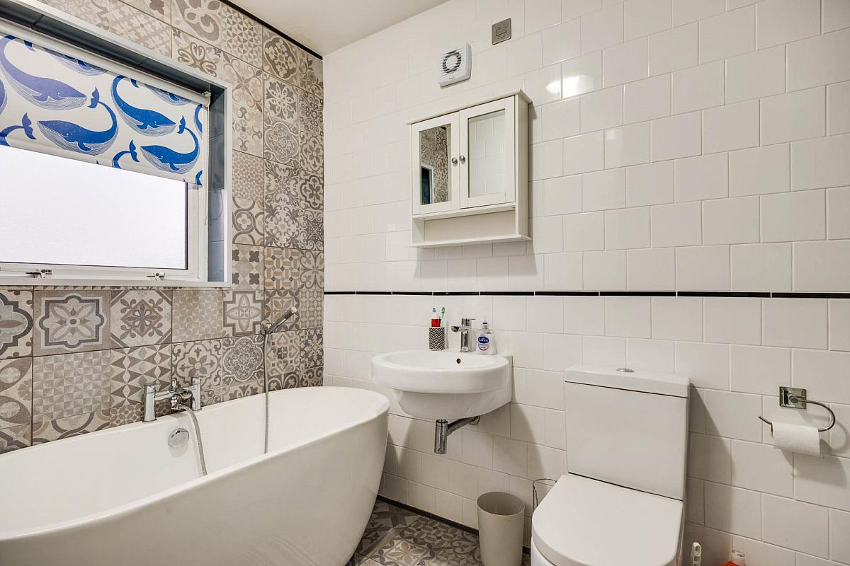 (10'11' x 5'6' & 4'6' x 2'11') Contemporary white suite, feature bath, hand held shower tap to bath, step in shower cubicle with electric shower, fully tiled inc decorative tiled floor & feature wall