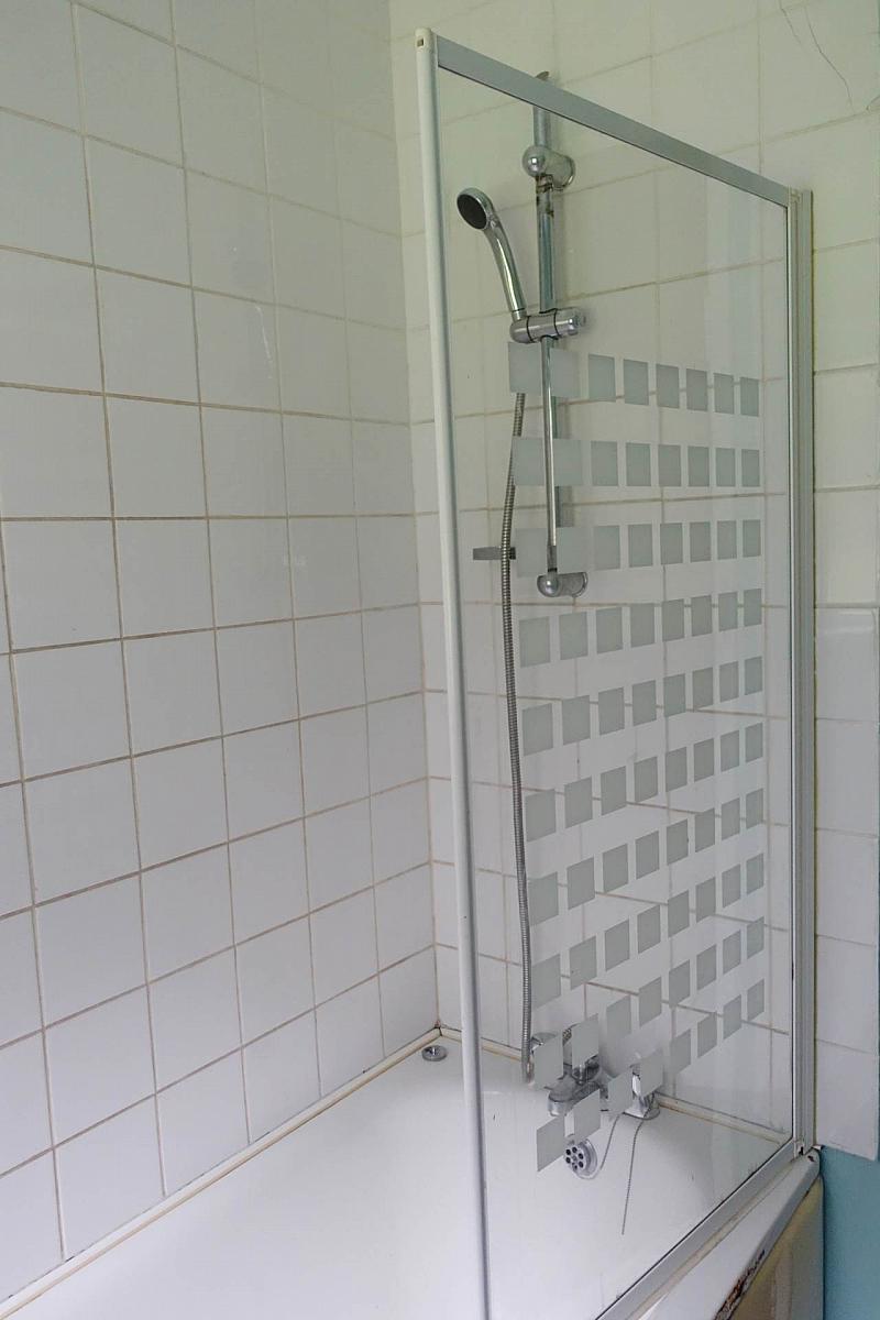 White suite, cast iron bath, shower head over bath & shower screen, tiled,floor & splash back, heated towel rail