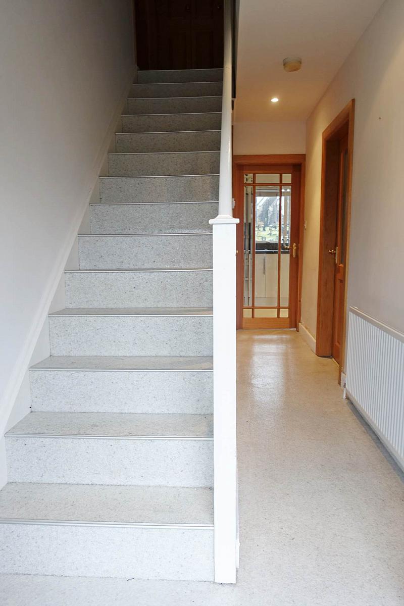 PVC exterior door with glazed sidescreen, epoxy floor covering including staircase, large hotpress & storage cupboard, ceiling cornice.