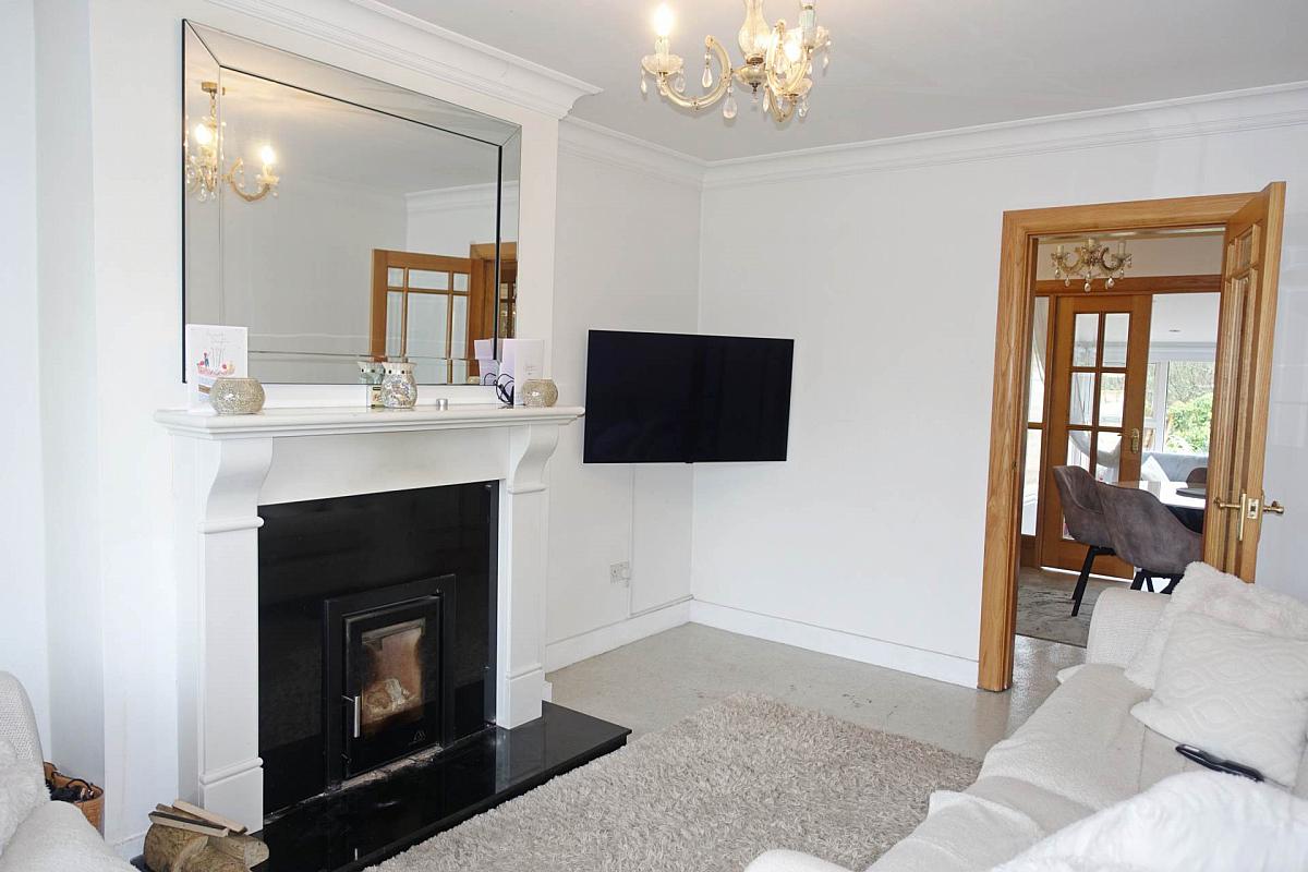 Tiled surround with wood burning stove, ceiling cornice, glazed door to Dining