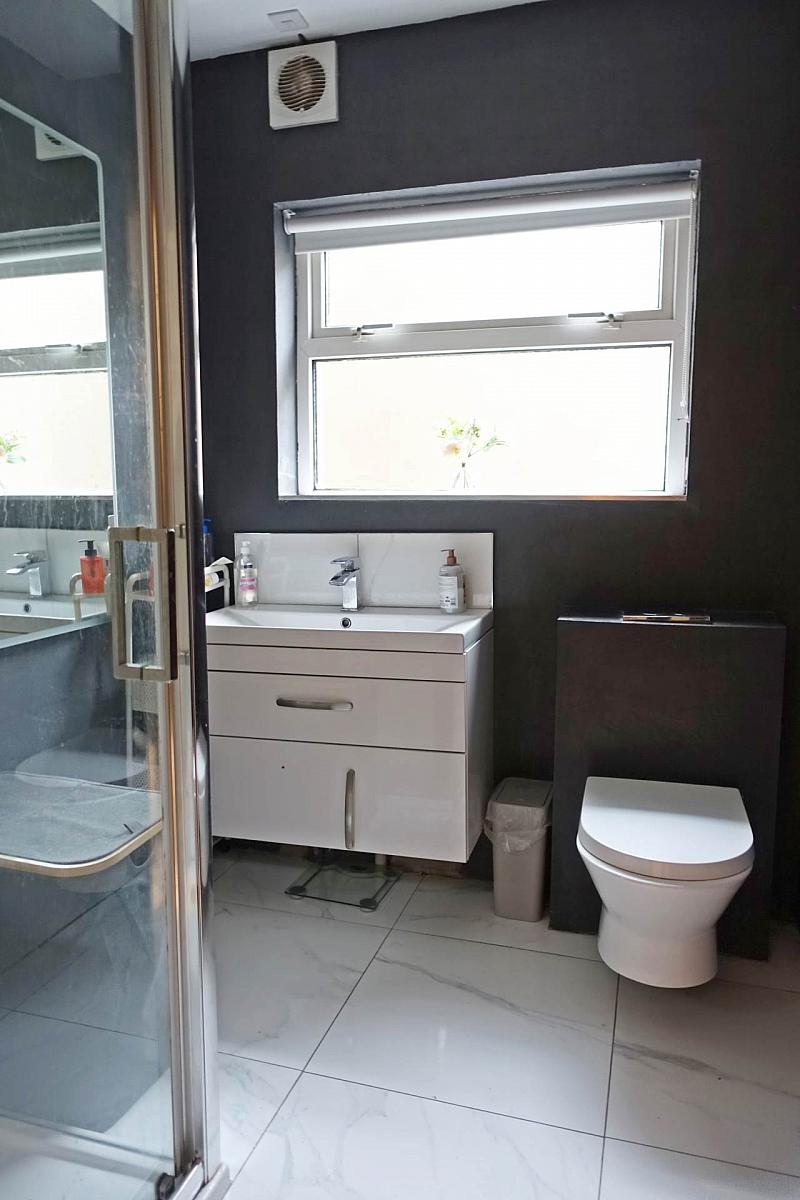 Contemporary style suite including vanity unit, concealed wc with push button control, enclosed shower cubicle, thermostatically controlled shower, tiled floor.