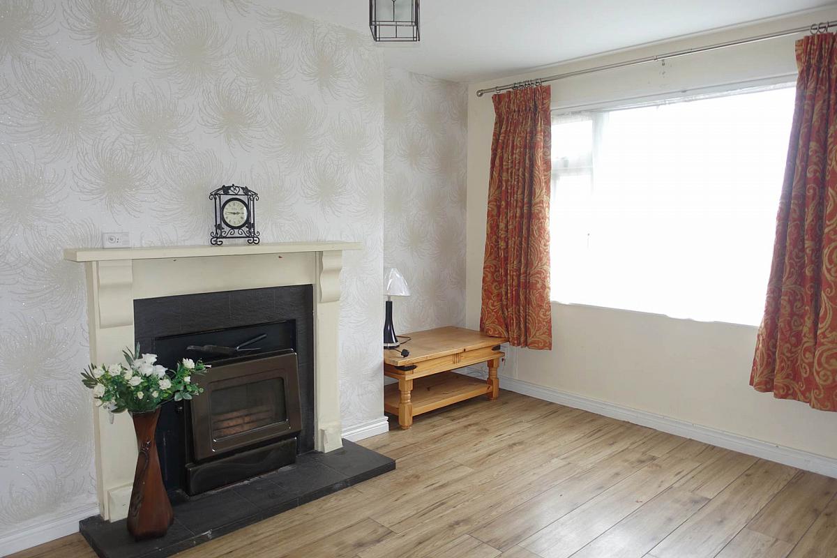 Solid wooden fireplace surround with Parkray stove connected to the CH system, laminate flooring