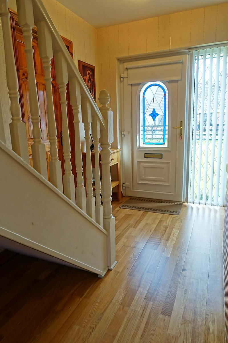 PVC exterior door, feature glazed inset, glazed side screen, solid Oak floor.