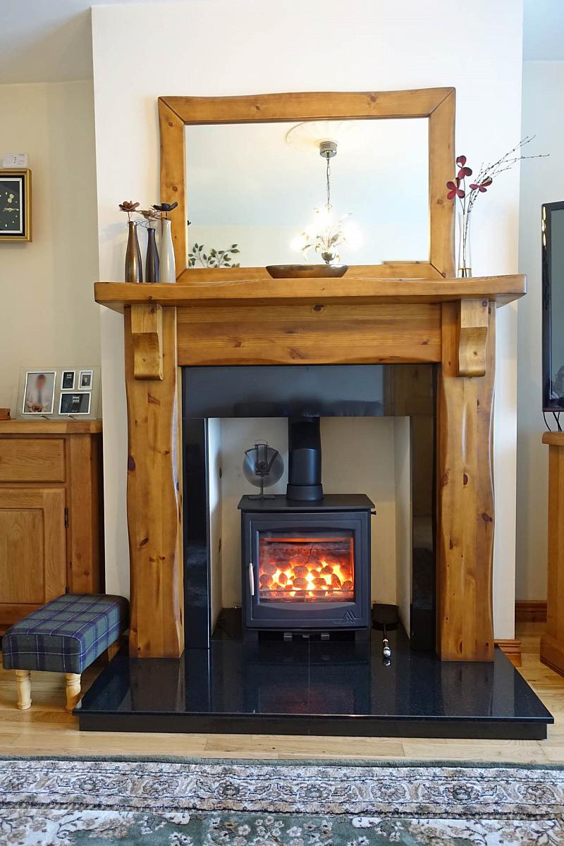 Solid wood fireplace surround with open heath, granite inset & hearth, multi fuel stove, moulded centrepiece, solid Oak floor.