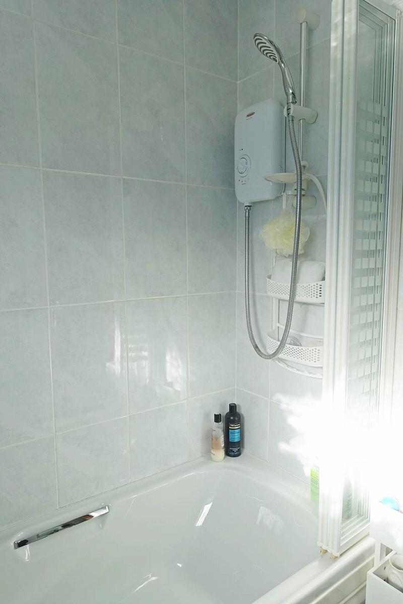 White suite with electric shower over bath, shower screen, fully tiled, heated towel rail, mirrored inset.