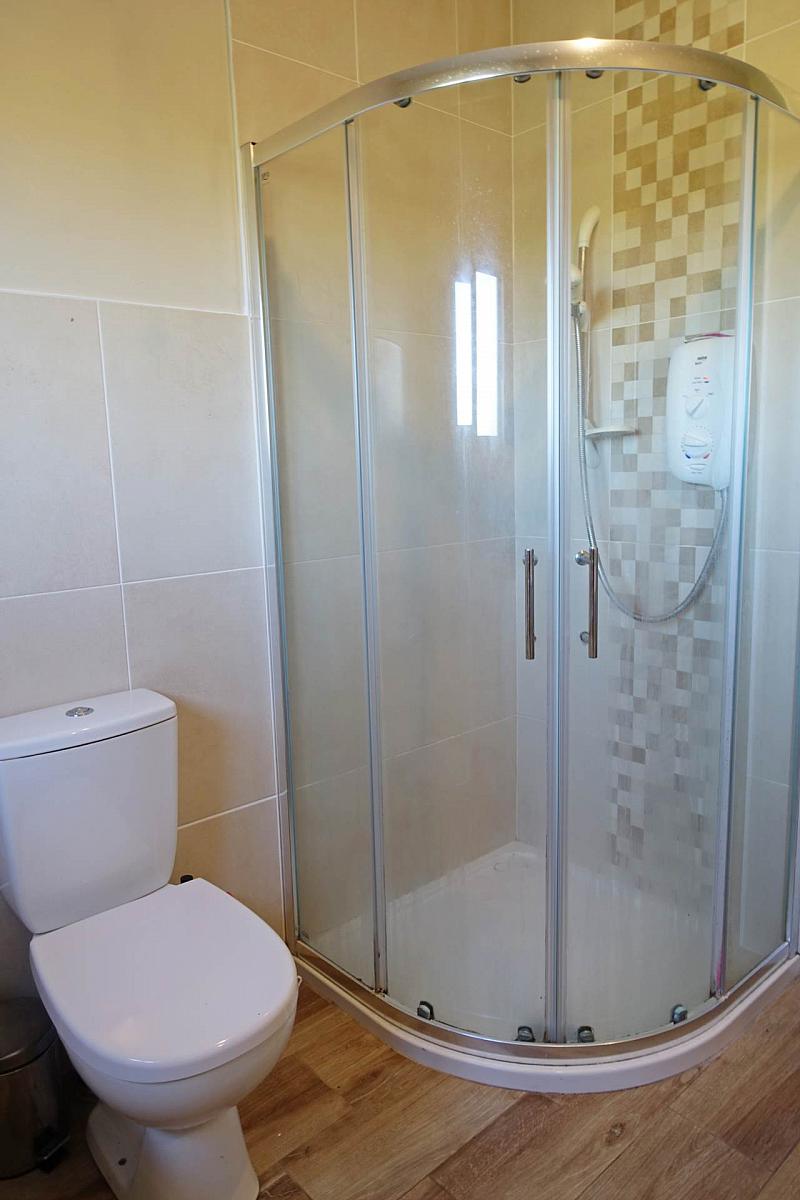 White suite, step in shower cubicle with electric shower , heated towel rail, vanity, heated towel rail.