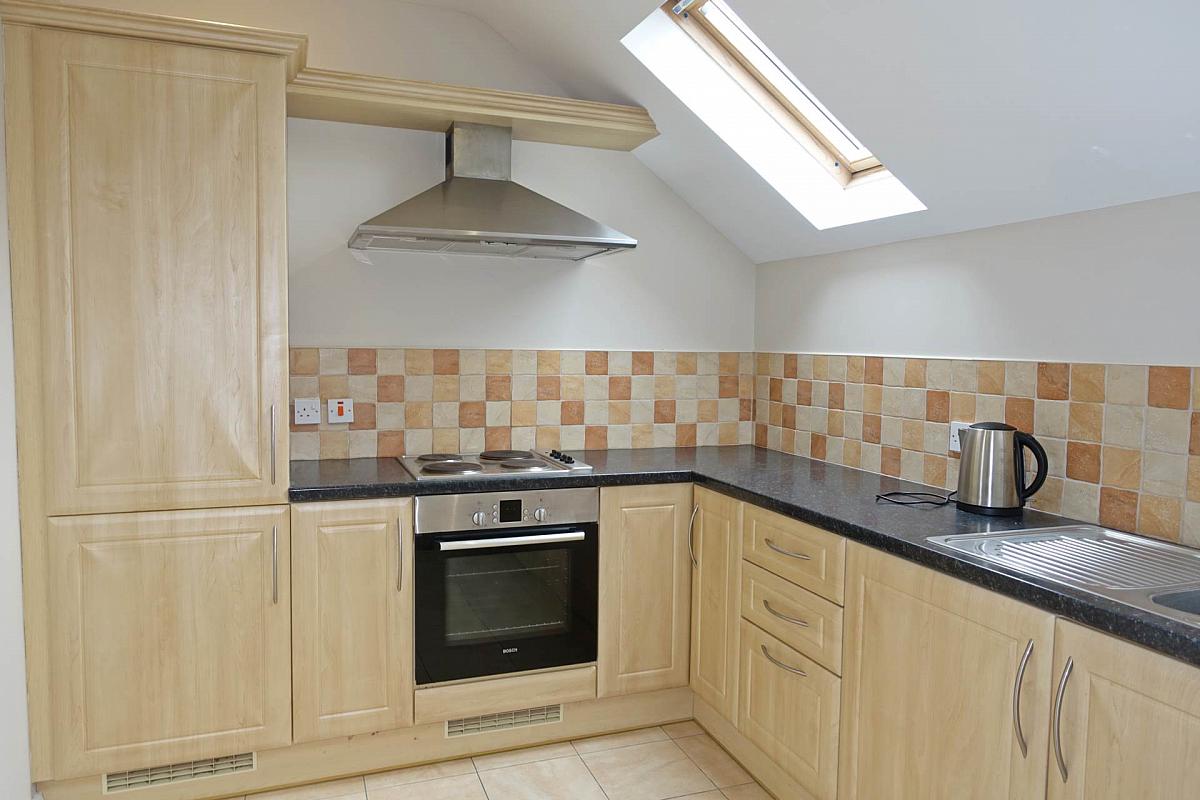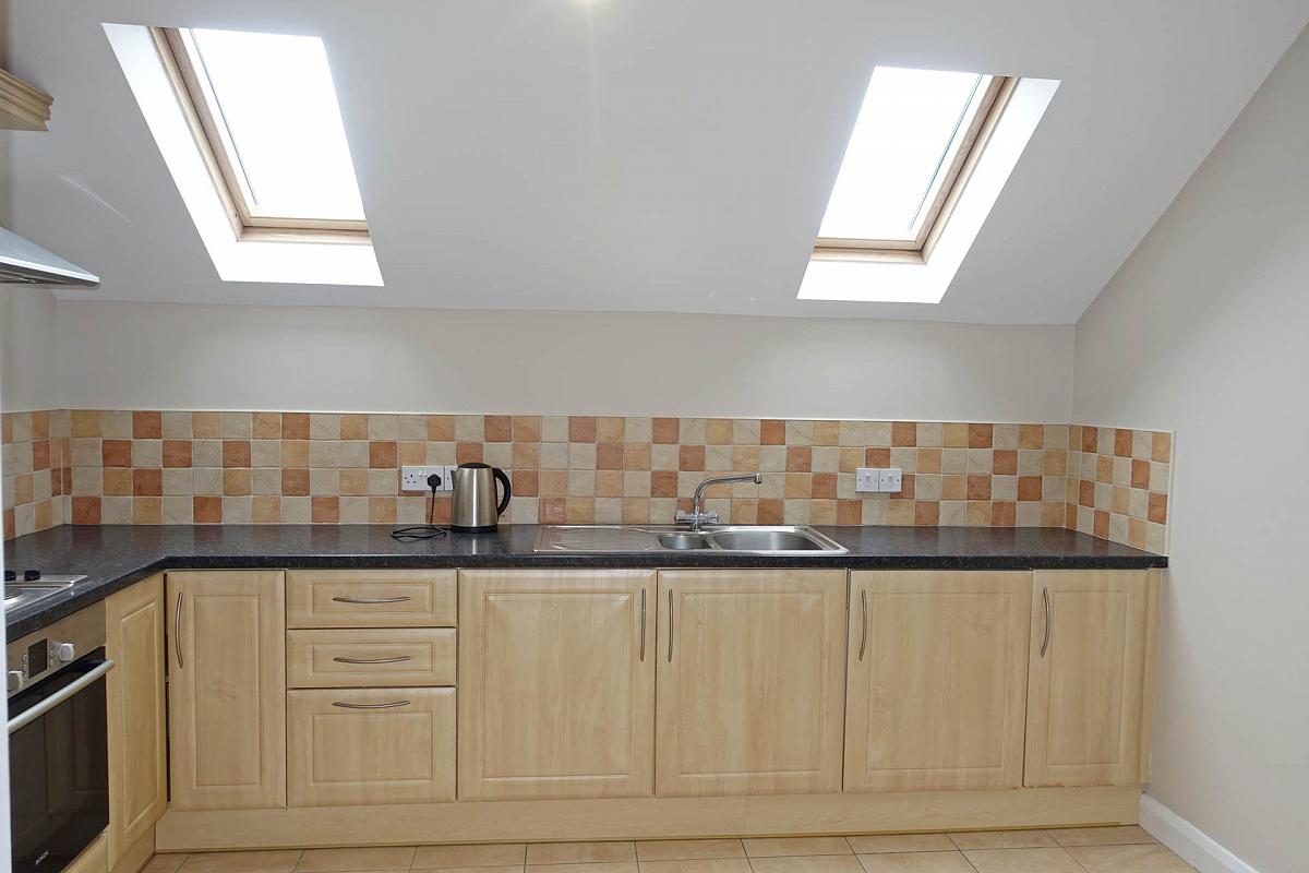 Fitted kitchen with a range of high & low level units, integrated hob, oven & grill, fridge freezer, plumbed for washing machine, stainless steel sink unit, tiled floor & splash back, recessed lighting.