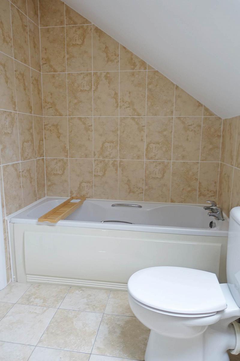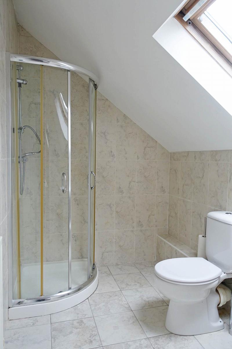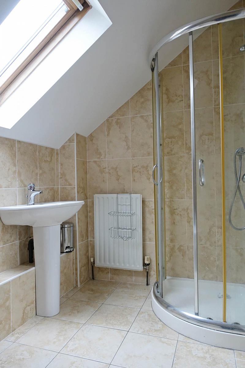 White suite, step in shower cubicle with thermostatically controlled shower, fully tiled.