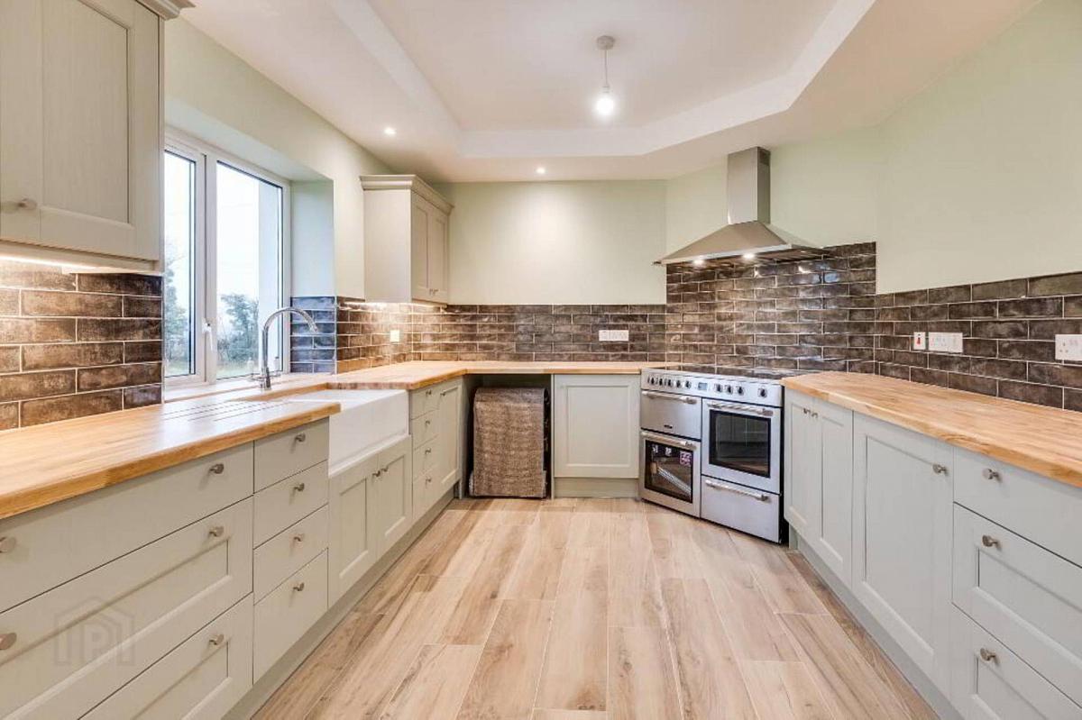 Luxury fitted shaker style kitchen with a range of high & low level units, wooden work top, ceramic double sink, range cooker, extractor fan, plumbed for dishwasher, space for fridge, tiled floor.