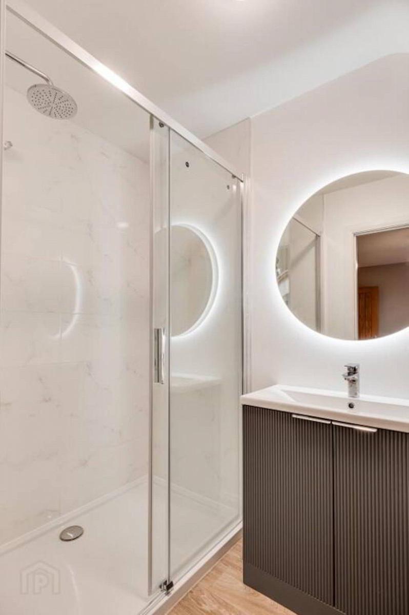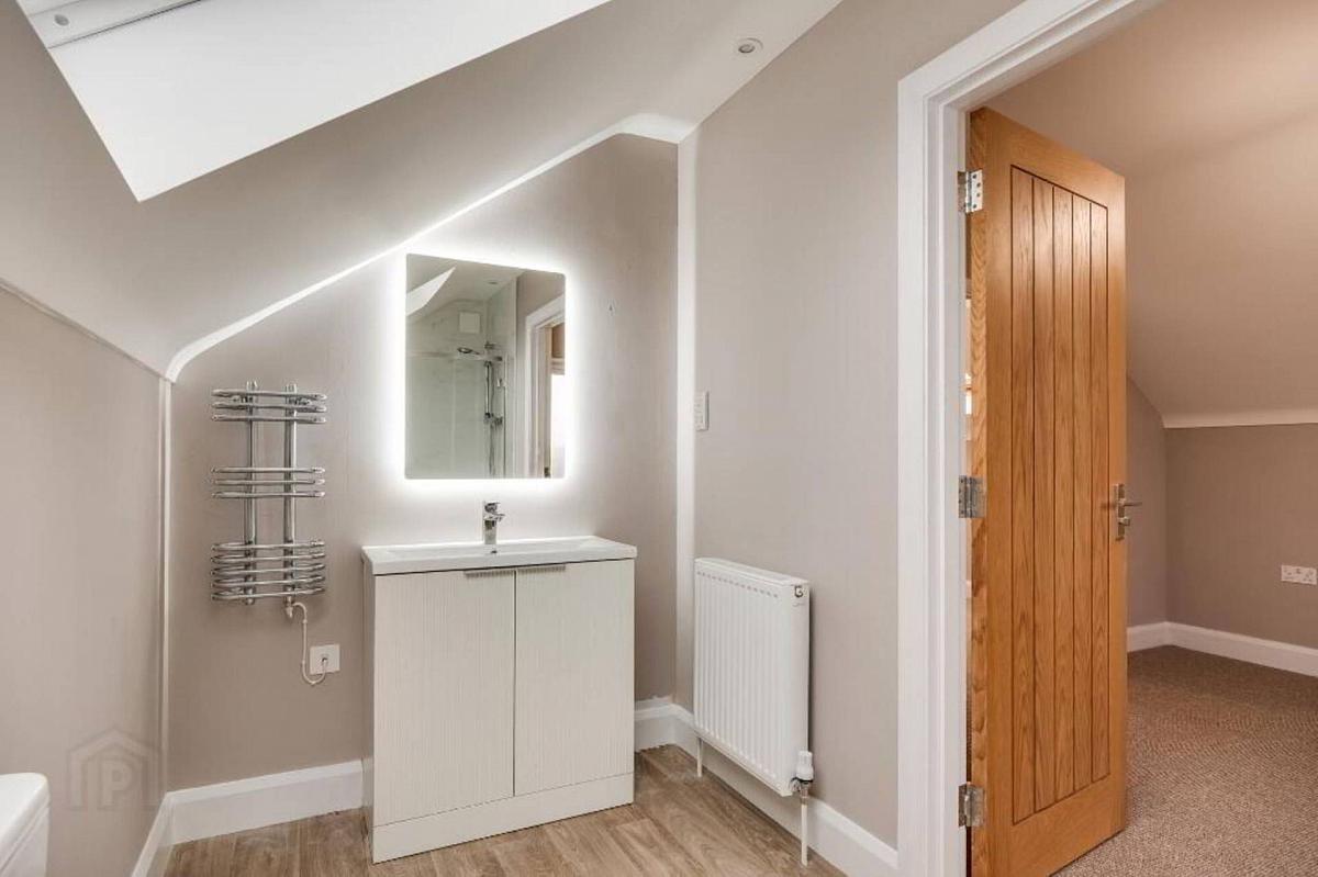 Contemporary suite, step-in shower, vanity unit, tiled surround, LED mirror, heated towel rail.