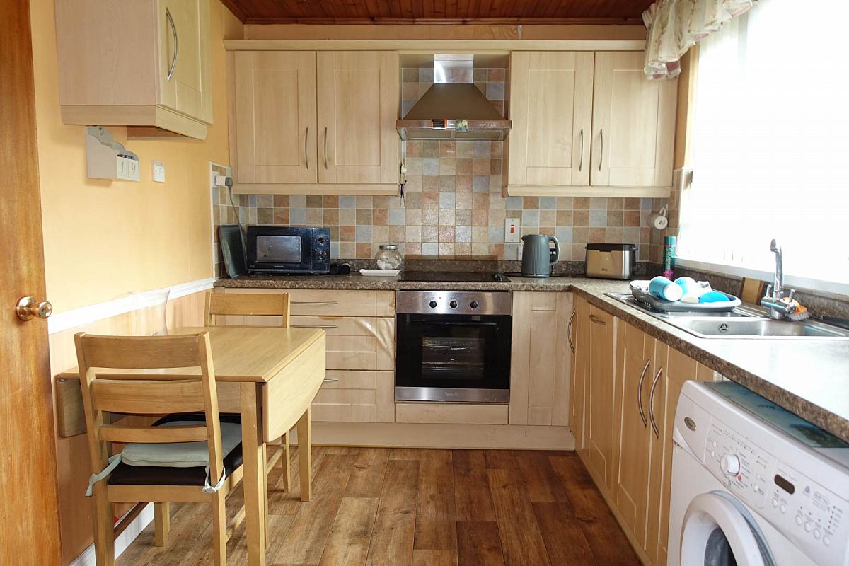 Fitted kitchen with a range of high & low level units, integrated hob, oven & grill, dishwasher, extractor fan hood, plumbed for washing machine, s.s.sink unit, tiled splash back , panelled ceiling