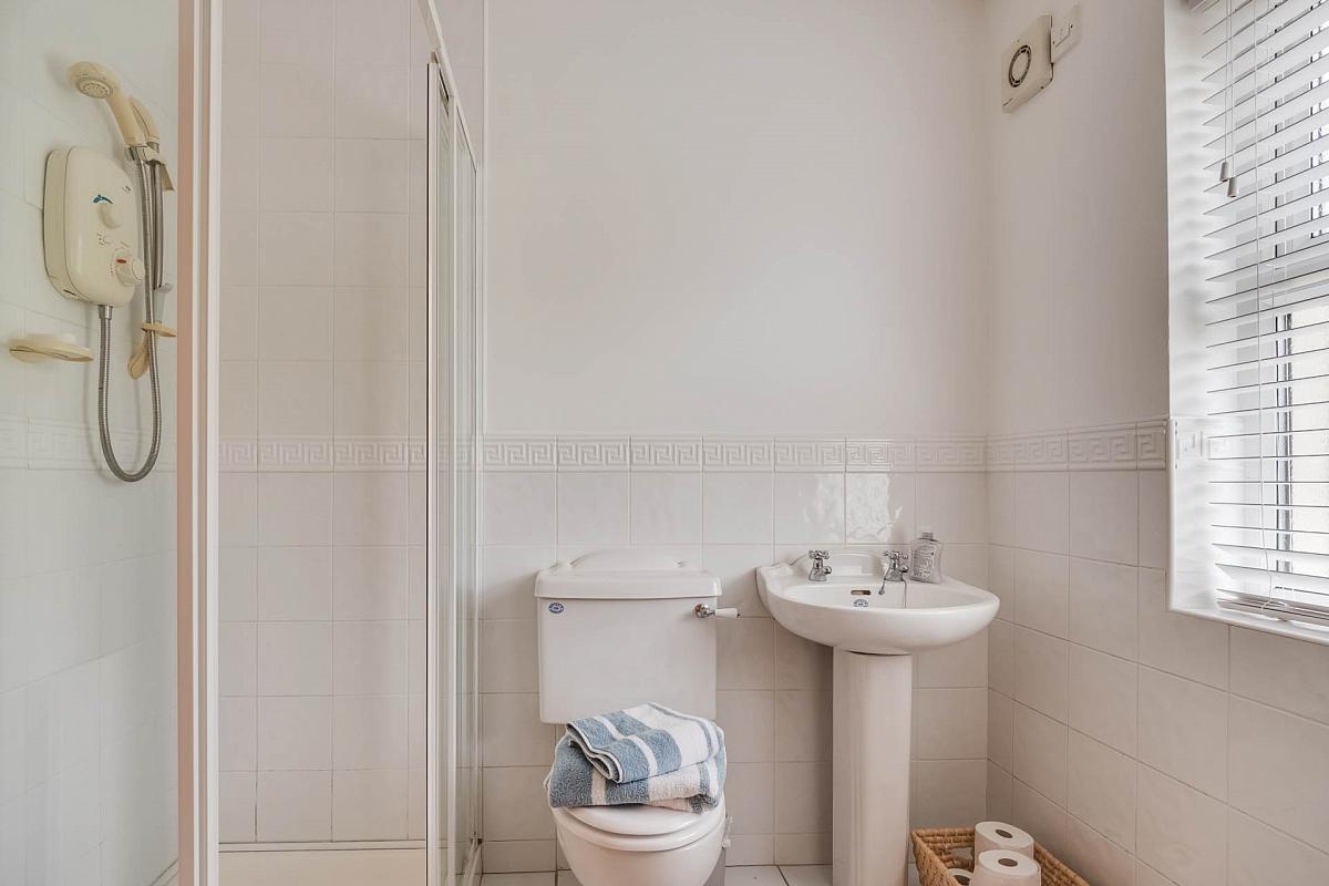 White suite, step in shower cubicle with electric shower, tiled floor, half tiled walls.