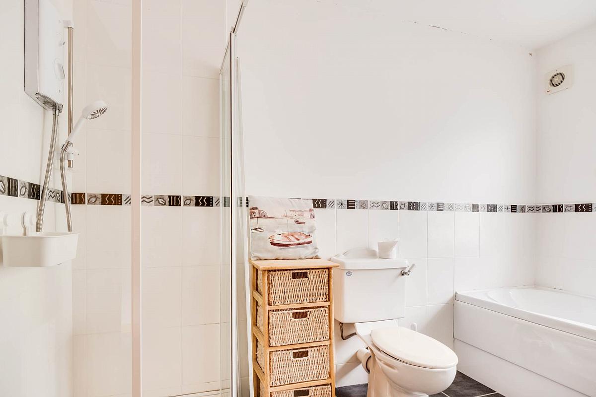 White suite, step in shower cubicle with electric shower, telephone shower taps to bath, tiled floor, half tiled walls.