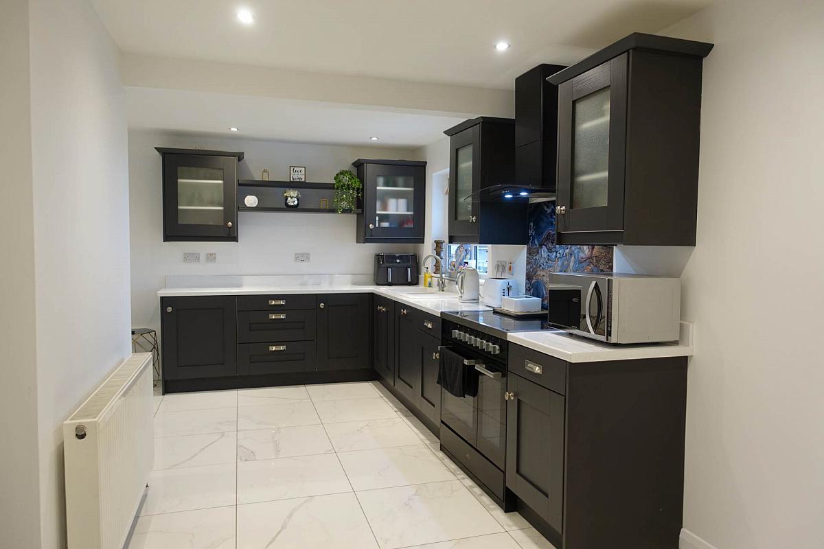 (& 3'7' x 2'1' ) Modern fitted kitchen with a range of high and low level units, glazed display unit, composite sink unit, integrated dishwasher, fridge, extractor fan hood, range cooker with 5 ring hob, tiled floor, recessed lighting.
