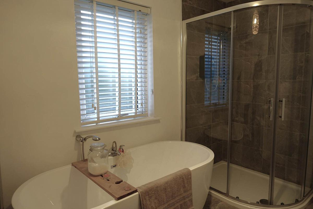White contemporary suite, feature bath, corner shower cubicle with electric shower unit, vanity unit, tiled floor & splash back.