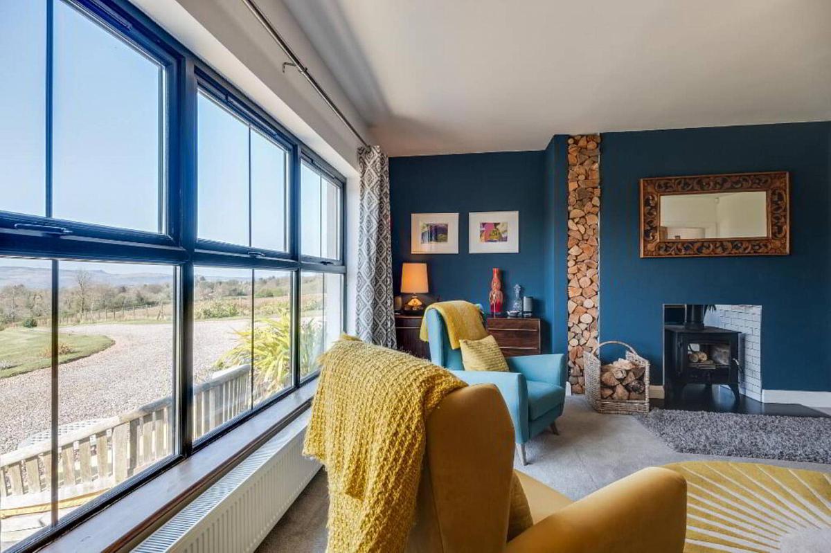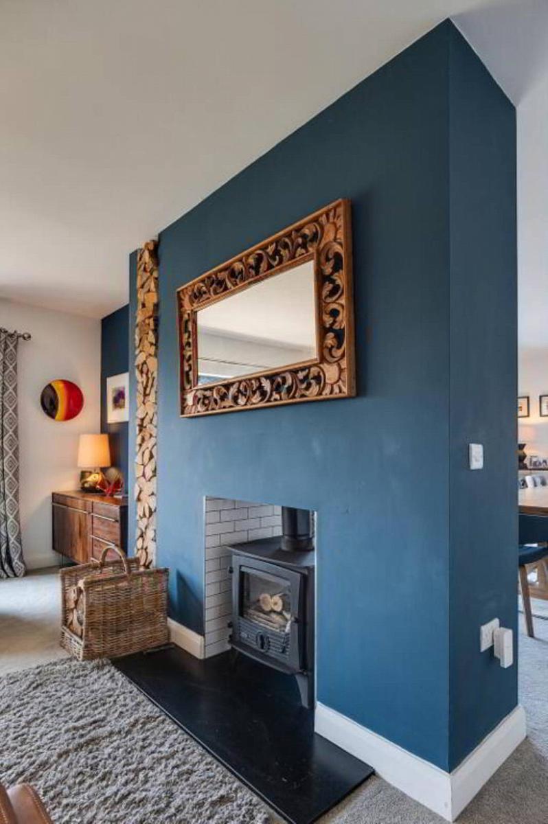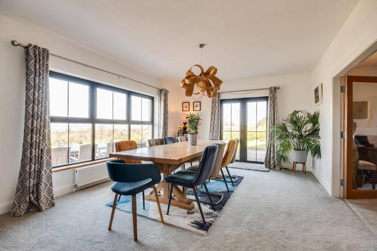 Open Plan to Dining Room, double sided multi fuel stove, log alcove, views towards the mountains.