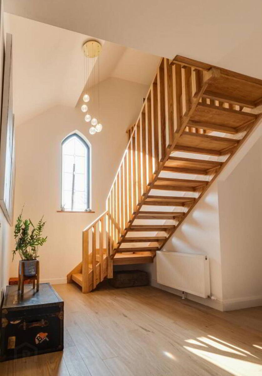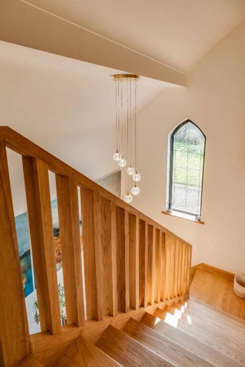 Hand built solid oak staircase overlooked by feature window, wood grain tiled floor.