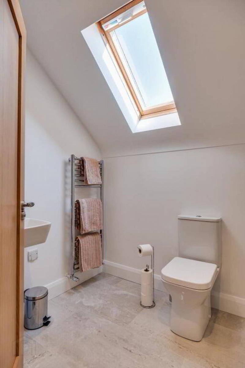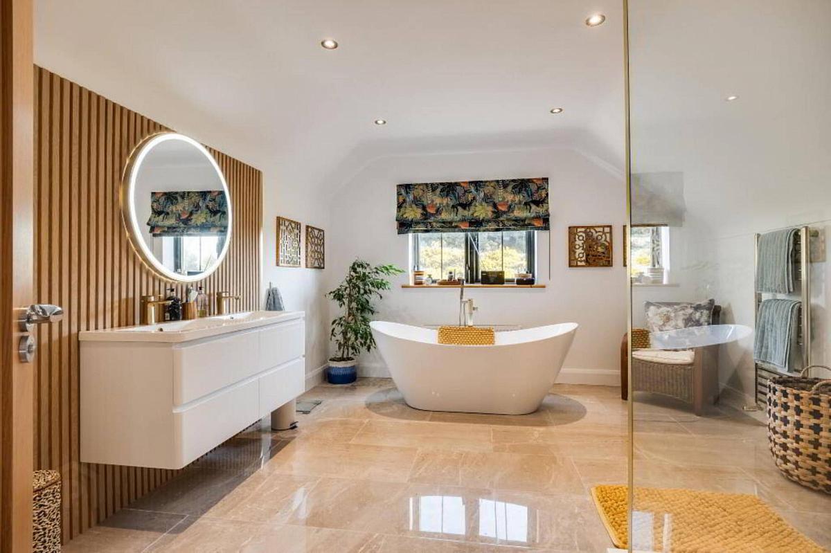 Luxury white suite incl. feature bath with free standing mixer taps vanity unit with double ceramic sink, wc with concealed push button controls, large step in shower cubicle with glazed sides and thermostatically controlled shower, alcove shelf, tiled floor & splashback, recessed lighting, feature wall panelling, heated towel rail.