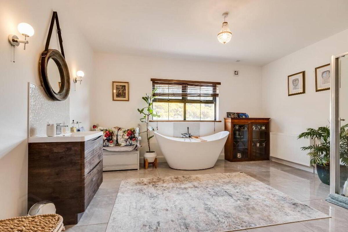 Luxury white suite incl. feature bath, wall fitted mixer taps, vanity unit with ceramic sink, large step in shower cubicle with glazed side & thermostatically controlled shower, heated towel rail, tiled floor & splashback.