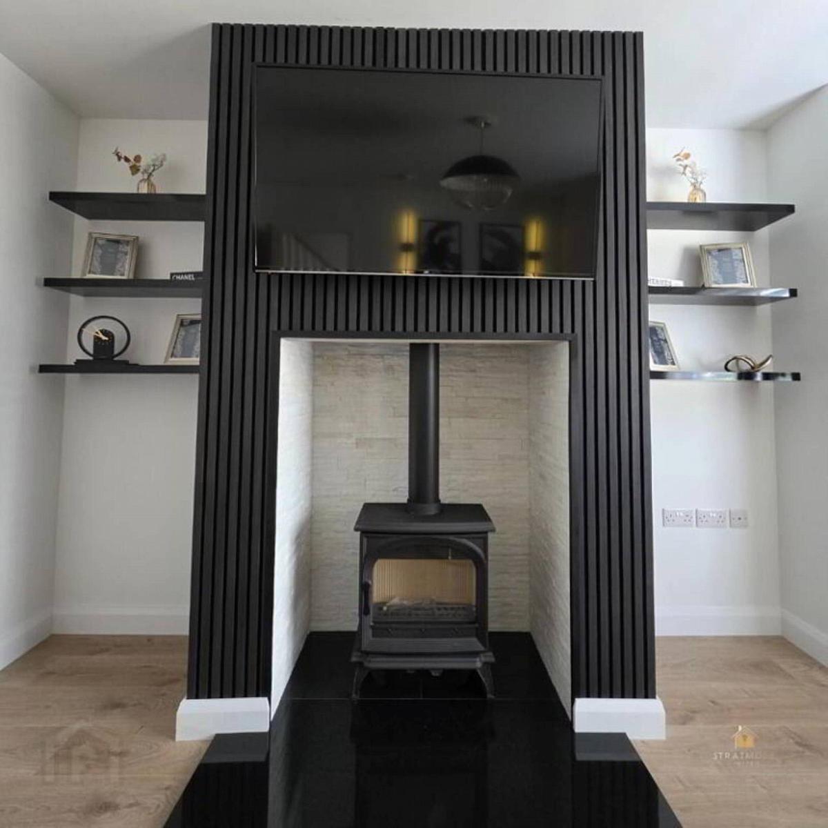 Into bay window, multi fuel stove.