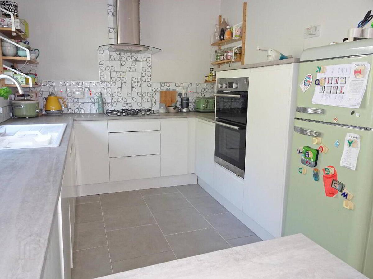 Modern fitted Kitchen with a range of high and low level units, integrated double oven and grill, hob, extractor fan hood, dishwasher, tiled splashback, tiled and wooden floor, tall radiator, double patio doors to decking area and garden, glazed door to Entrance Hall.