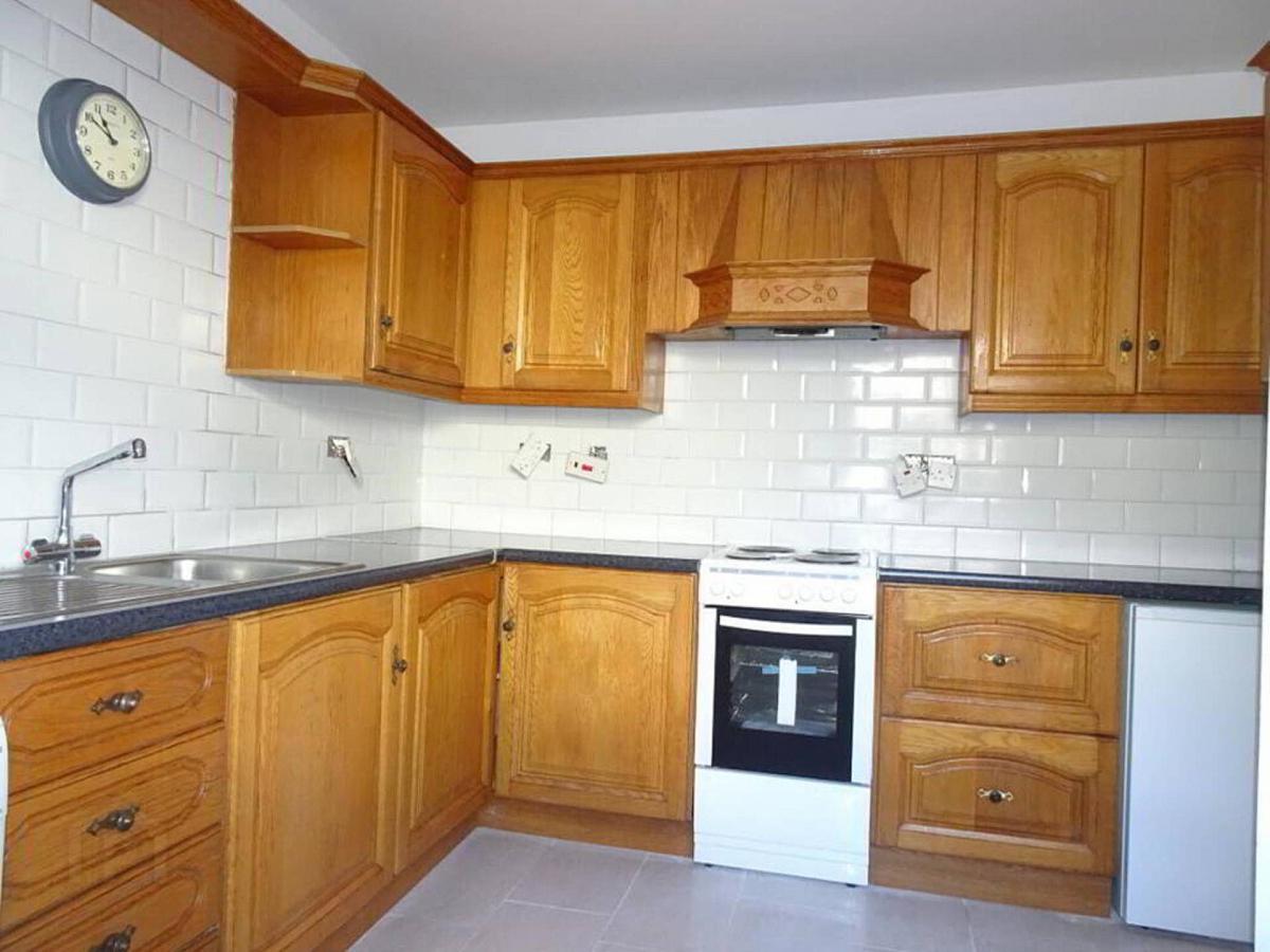 With stainless steel sink unit, range of high and low level cupboards, tiled in between, electric cooker, extractor fan, fridge, laminated floor.