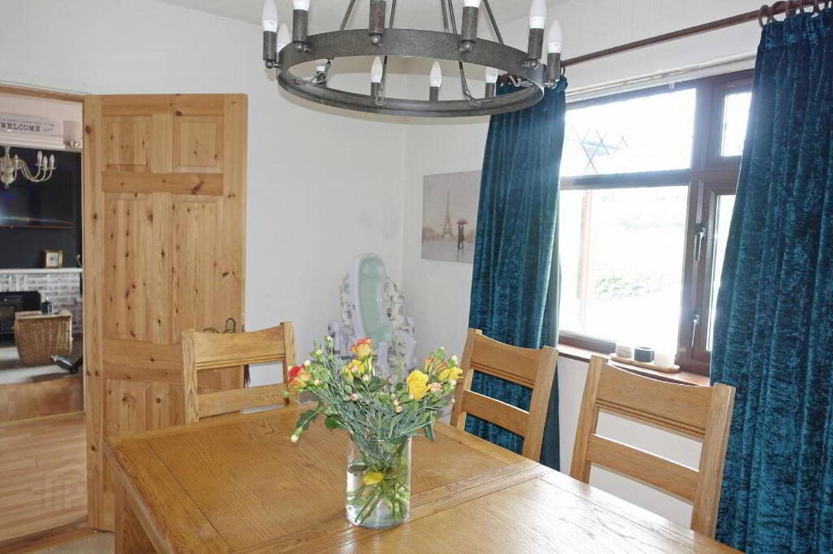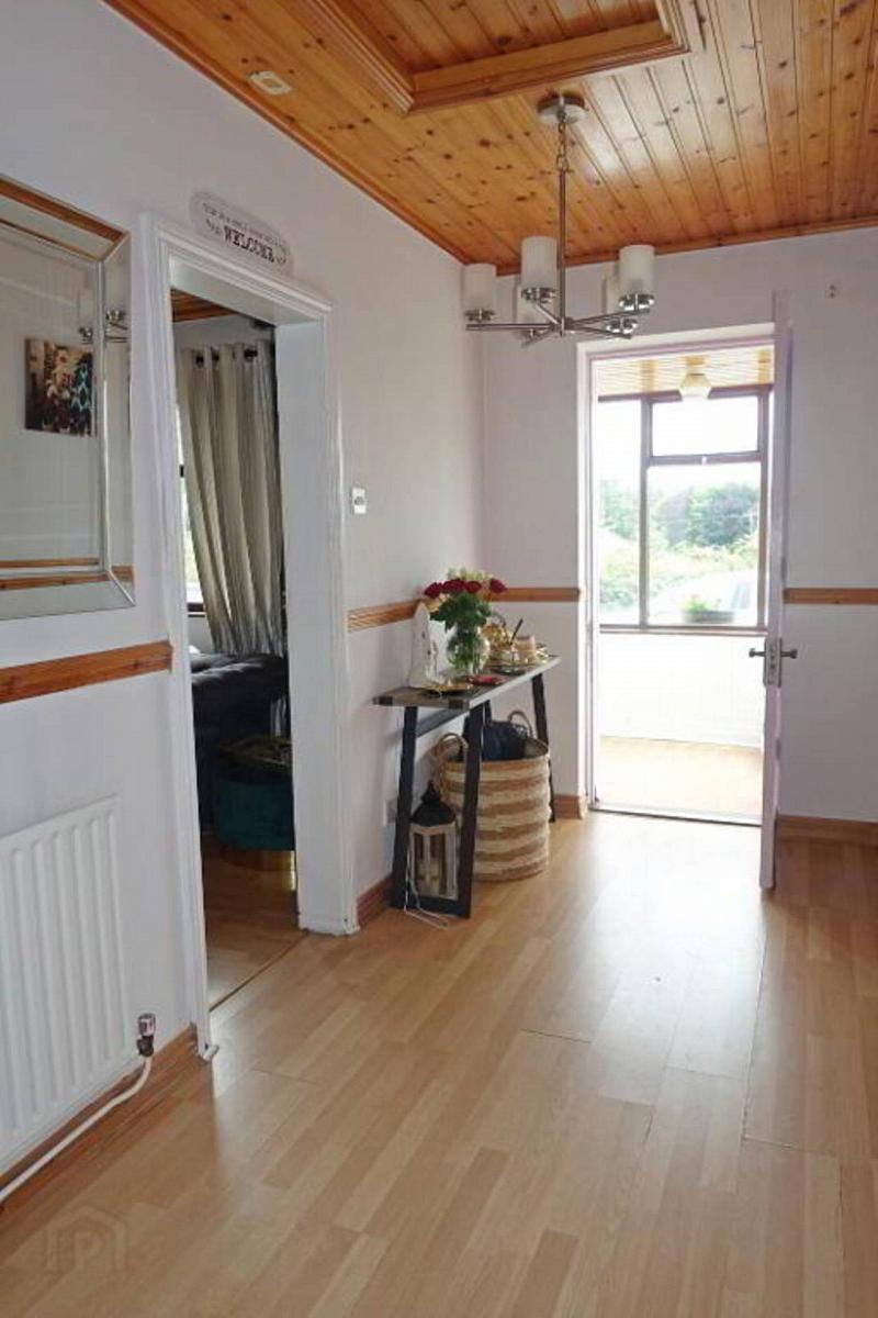 PVC exterior door with glazed inset, laminate flooring, tongue & groove panelling.