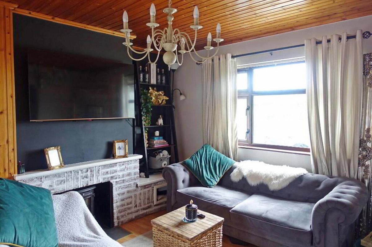 Brickwork fireplace surround, multi-functional stove, laminate flooring, hotpress.