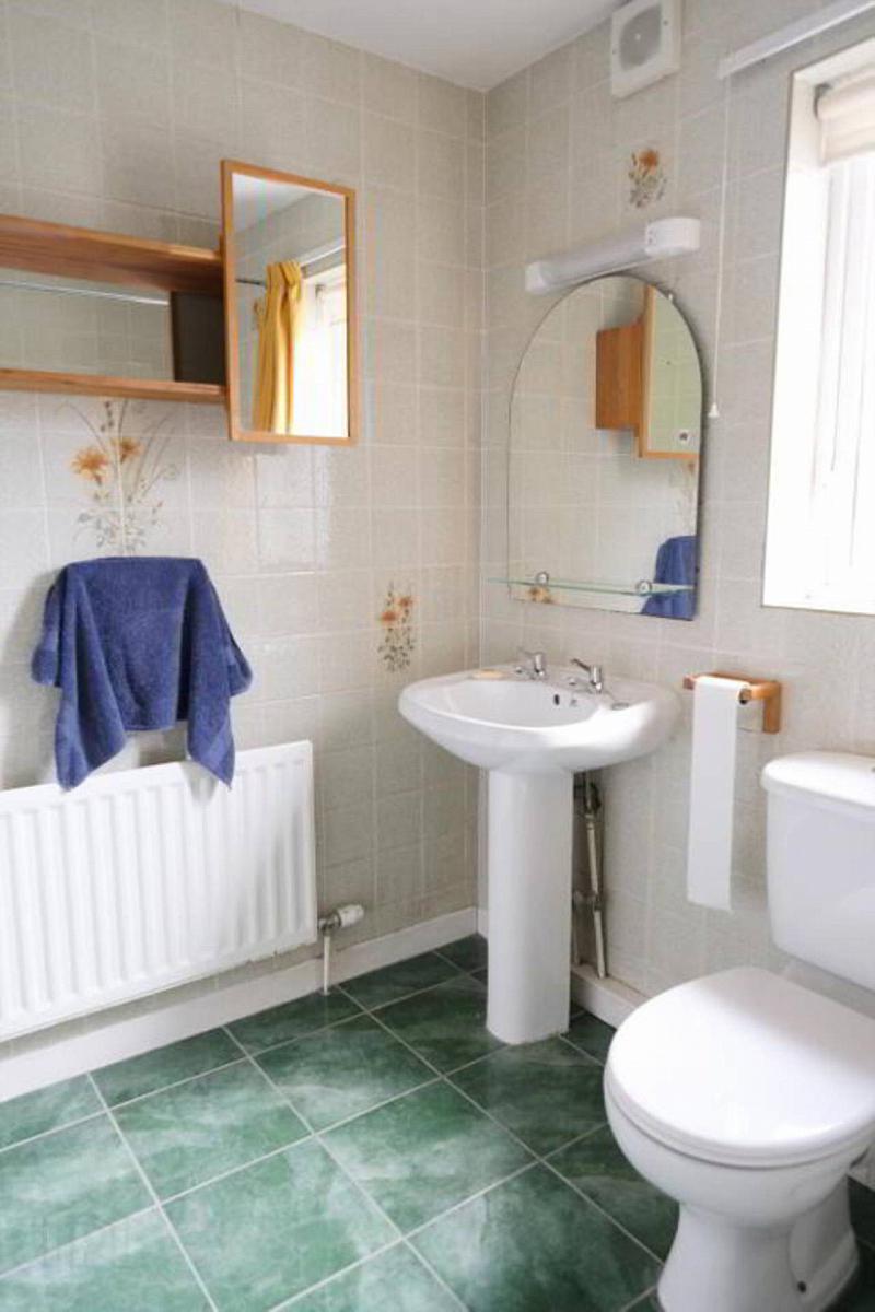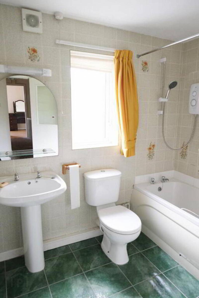 With 3 piece suite, electric shower over bath, fully tiled walls, shaver light, tiled floor.